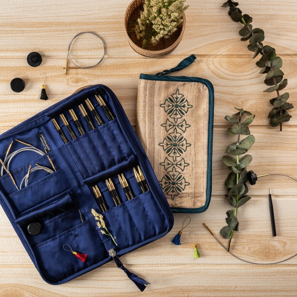 O estojo é feito de seda Khadi, um material indiano historicamente significativo. O exterior apresenta um lindo bordado com motivos florais. No interior, há espaço para várias pontas de agulhas intercambiáveis e cordas. O estojo com fecho mantém todos os conteúdos armazenados e organizados com segurança. Estes conjuntos de agulhas são projetados por artesãos para gerações de uso por tricoteiros habilidosos.